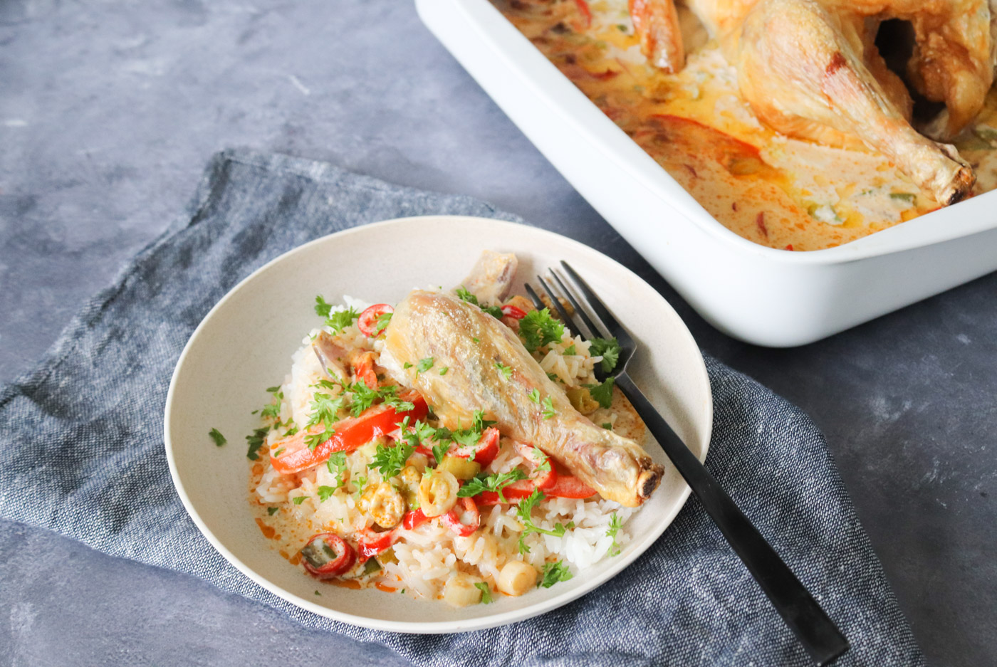 Asiatisk inspireret kylling i fad med kokosmælk er et hit herhjemme. Den tager ingen tid at lave og passer sig selv i ovnen. Den kan serveres med ris eller nudler