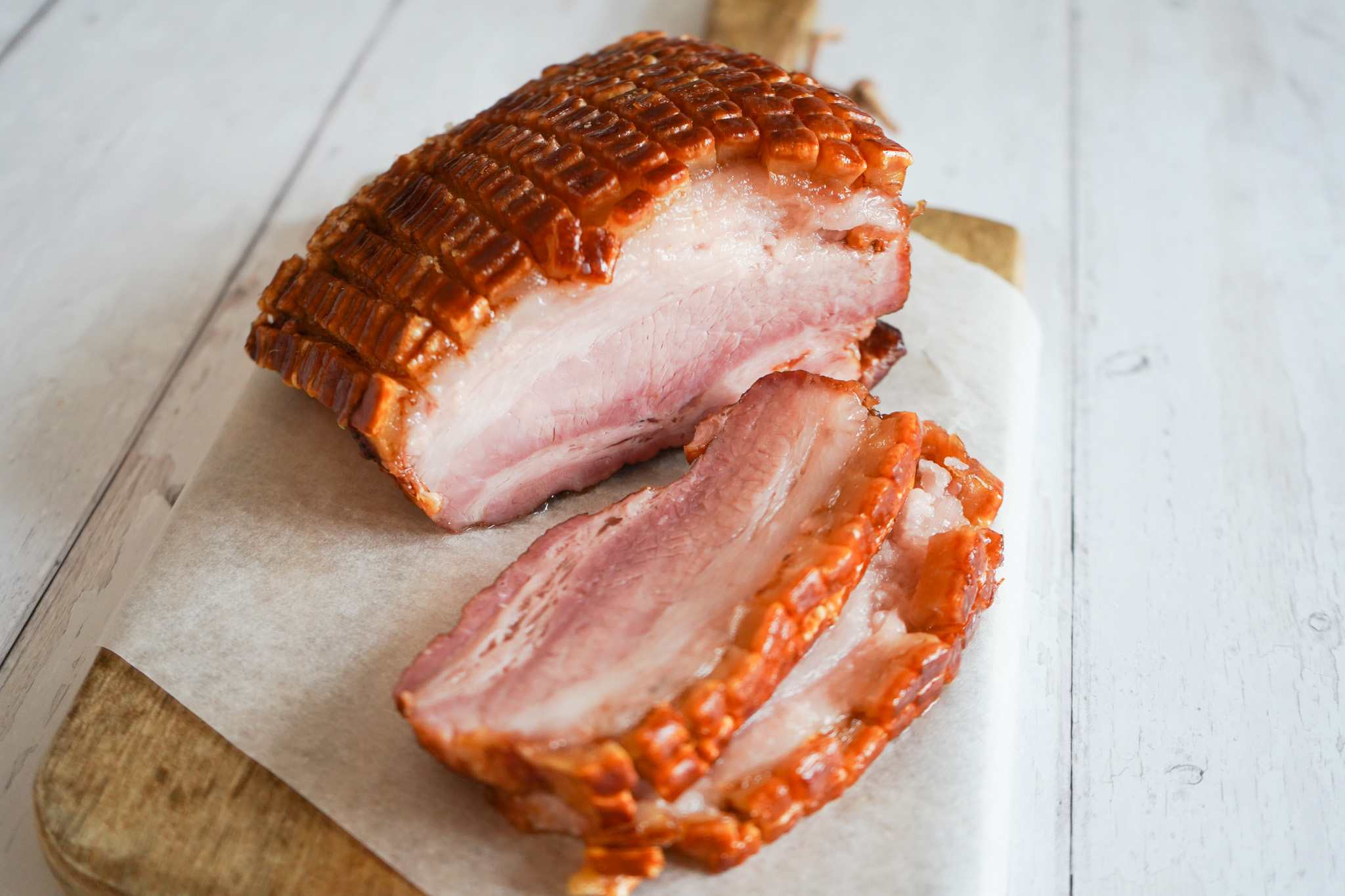 Baconsteg med sprøde svær og saftigt kød. Perfekt som steg til aftensmaden, men også skåret i skiver i sandwich eller tern til biksemad dagen efter.