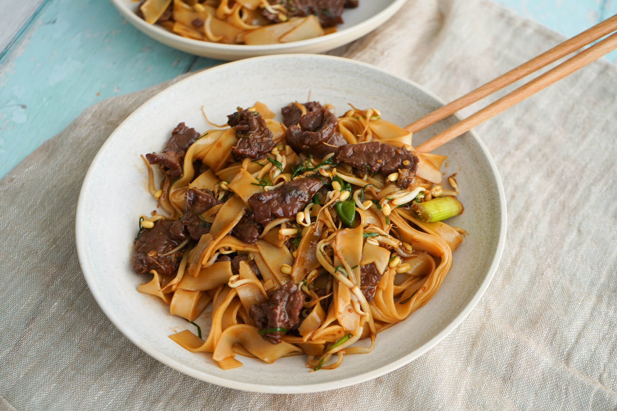 Beef chow fun er en skøn kinesisk ret med risnudler, forårsløg og oksekød. Den tager ingen tid at bikse sammen og den smager bare så godt.