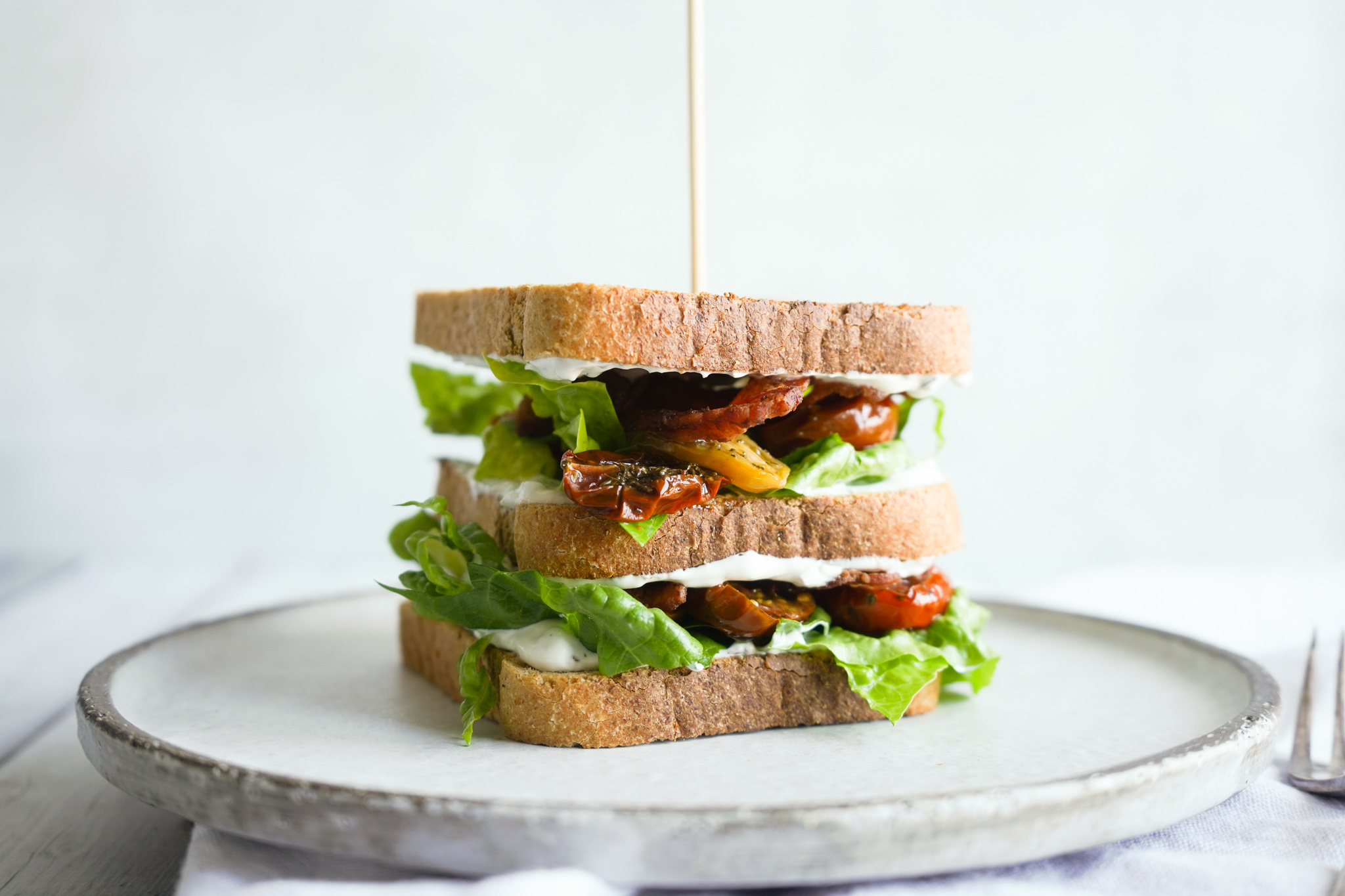 - Smør toppen med dressing, så salat, tomater og 2 skiver bacon og smør en tredje skive brød med dressing og vend dressingsiden nedad mod fyldet. Så har du en vildt lækker BLT.