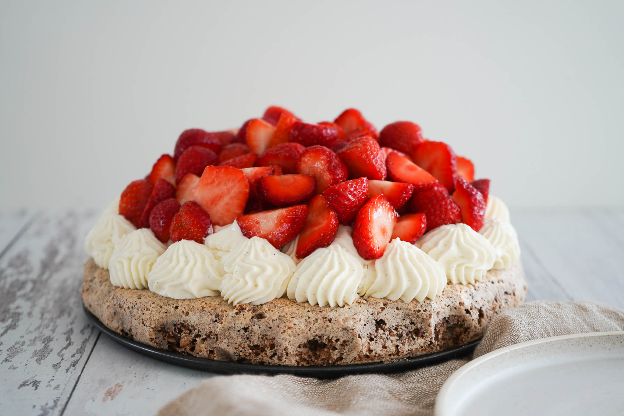 Cheesecake jordbærkage smager himmelsk. Den er lavet med en nødde chokoladebund og toppet med cremet vanilje cheesecakecreme og masser af friske jordbær.