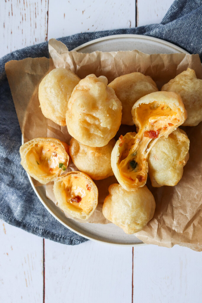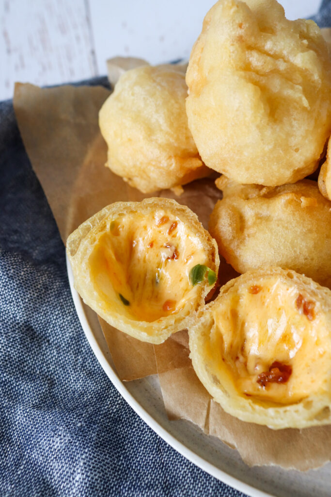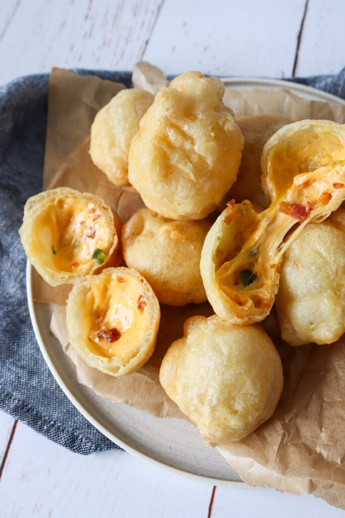 - Tag nu de første par stykker og dyp i dejen igen og kom i frituren. Denne gang i 4 minutter. Brug evt. en hulske til at vend dem nogle gange og holde dem nede, så de får varm olie over det hele og bliver sprøde hele vejen rundt. Når de er færdige, så kommes de på en ny tallerken med køkkerulle. Denne dobbelt dej gør dem både ekstra sprøde og det sikre at osten bliver indeni og ikke løber ud.