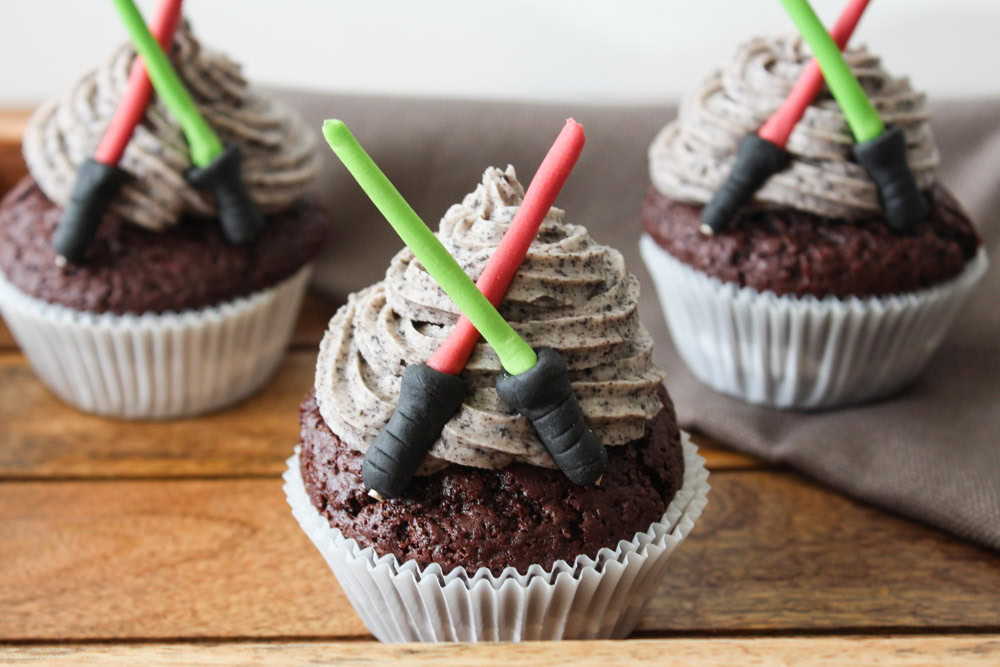 These chocolate and baileys cupcakes with oreo buttercream are the best!!! They are so moist and the taste is incredible! It is Star Wars Day tomorrow, so I have made some lightsabers for some of the cupcakes!