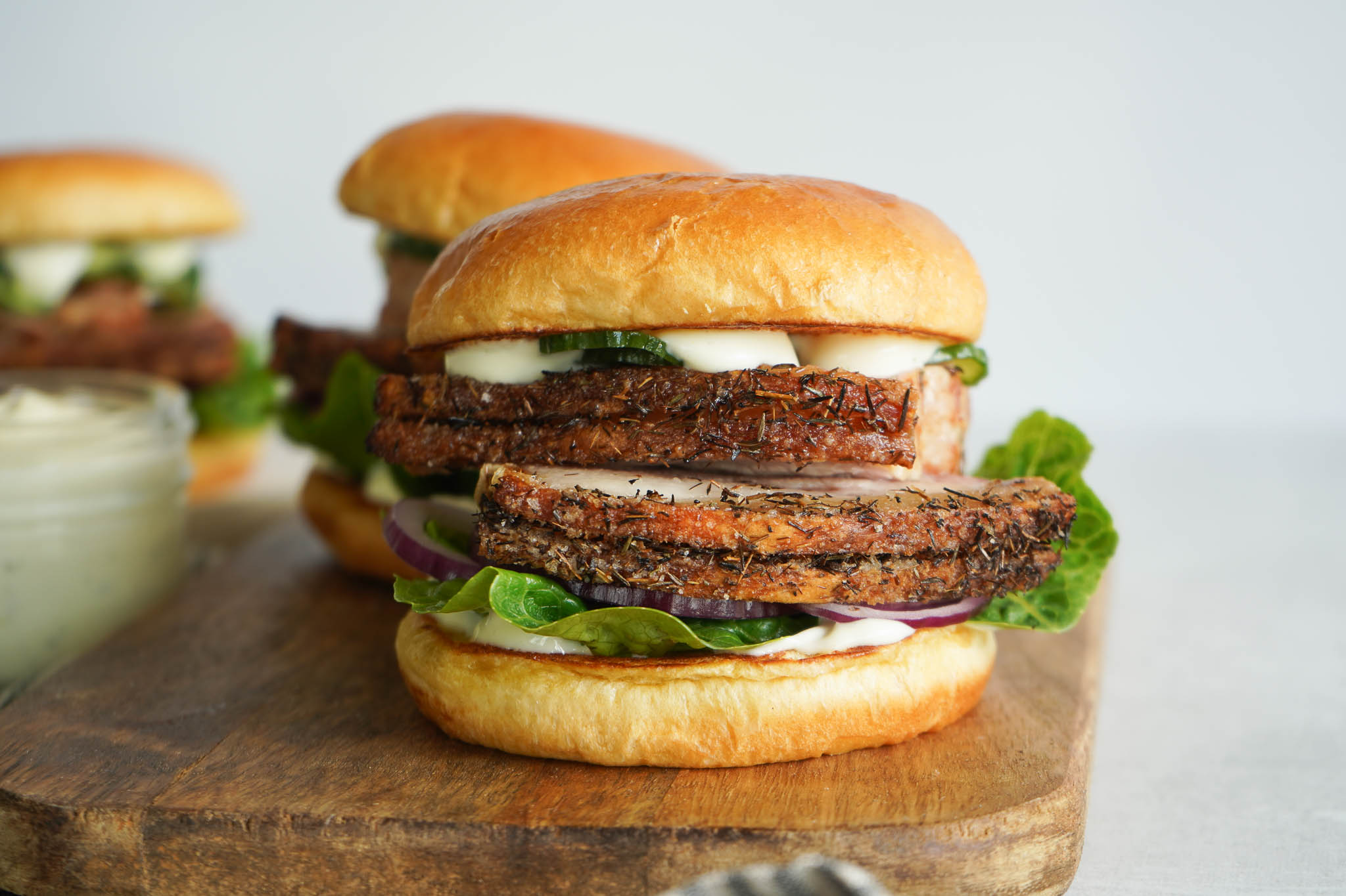 Jeg elsker hjemmelavet flæskestegburger eller sandwich og de her smager så godt. De er med grillet flæskesteg, bearnaisemayo og min mormors opskrift på agurkesalat – hele denne kombi passer så godt sammen. Prøv også flæskestegssandwich med persilledressing.