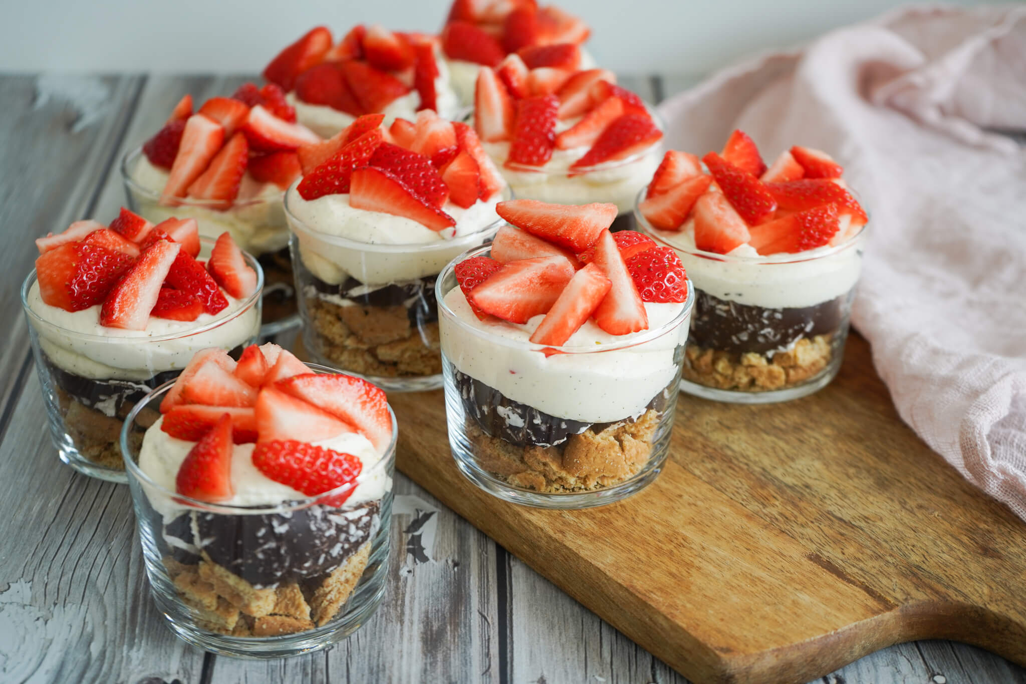 Flødeboller cheesecake dessert i glas smager fantastisk! Sprød kiksebund, flødeboller, toppet med cheesecakecreme og jordbær. En rigtig skøn og NEM dessert, som er færdig på ingen tid. Cremen kræver ikke husblas.