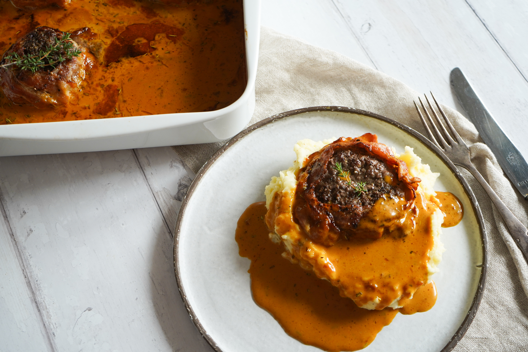 - Form 6 gode bøffer af kødet og vikle 2 skiver bacon om hver og sæt fast med tandpinde.