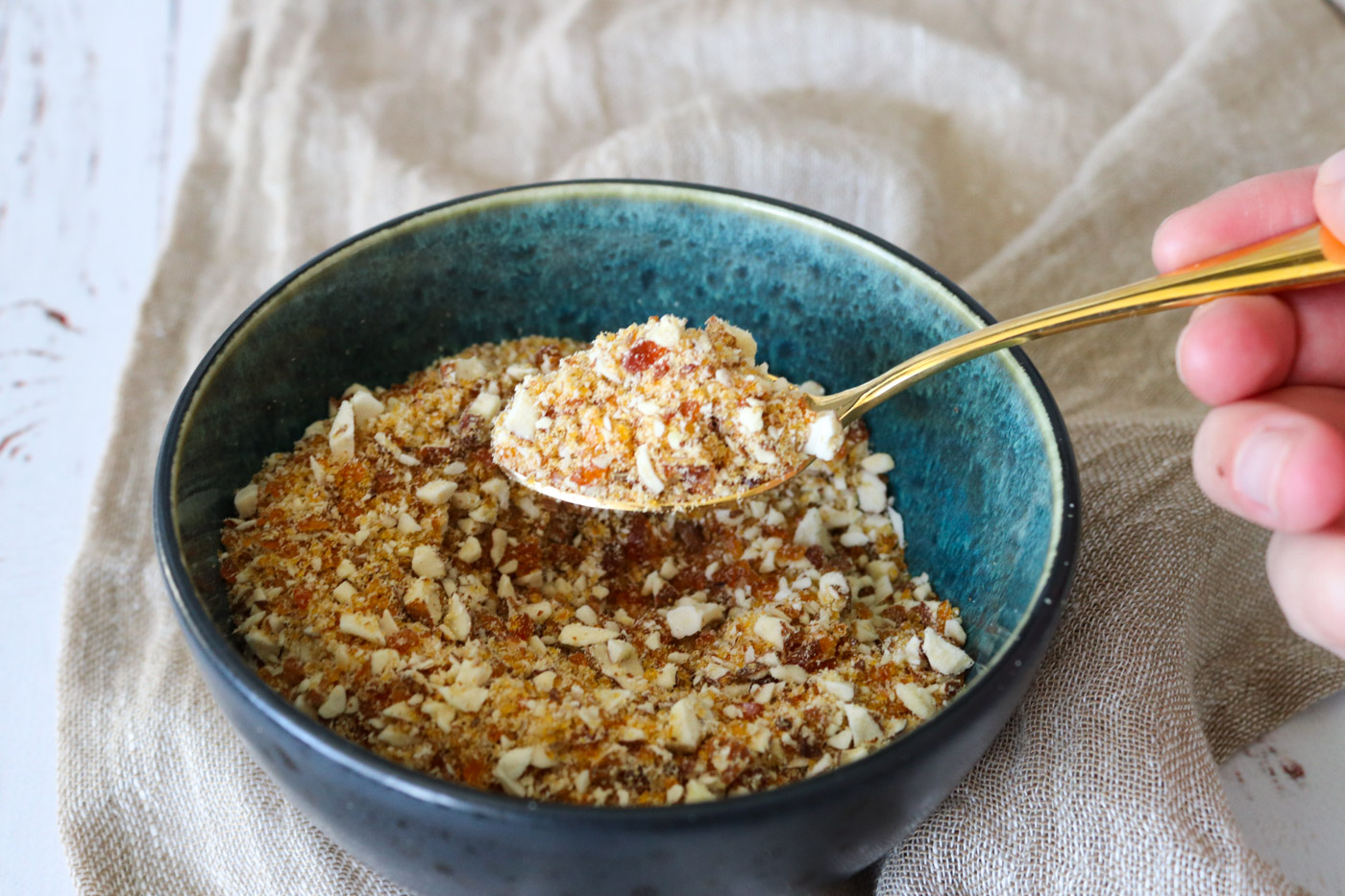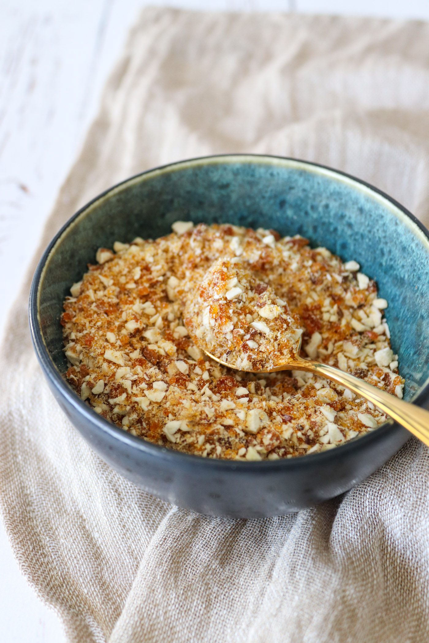 • Lad krokanten køle helt ned og knæk den så i mindre strykker og knus i en minihakker eller foodprocessor. Du bestemmer selv hvor groft eller fint det skal hakkes.