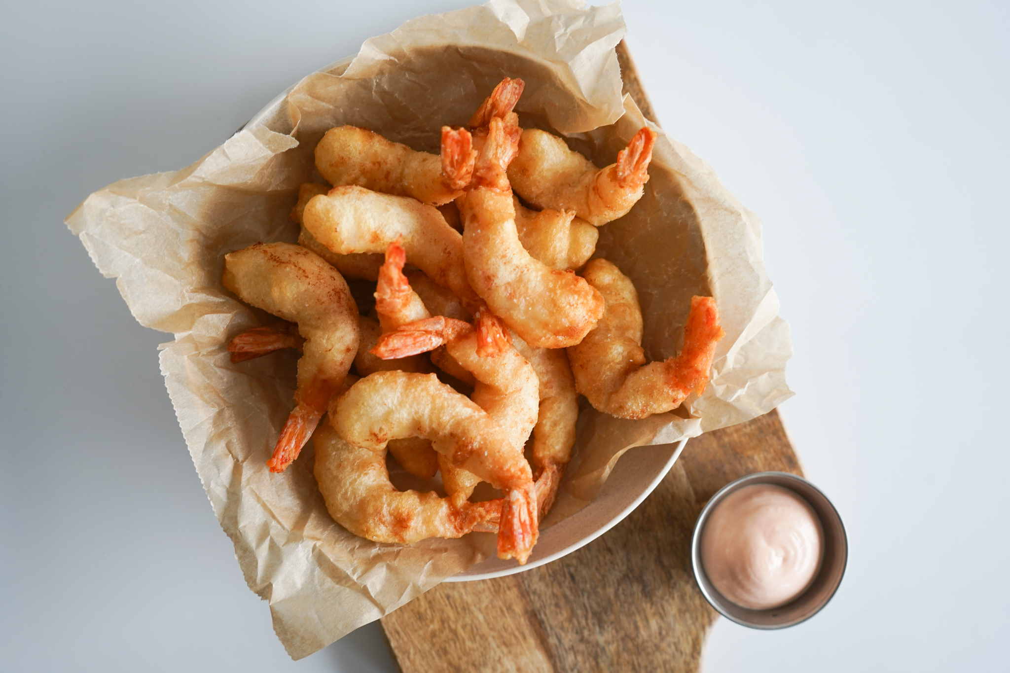 - Dyp rejerne i mel og så i dejen og friter herefter, i et par minutter indtil de er let gyldne – husk på at rejer ikke må få for meget, så går det for langsomt med at få farve og sprødhed på rejerne, så skru lidt op.