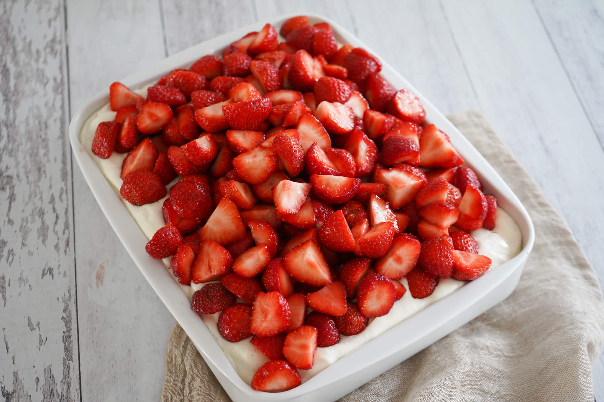 Er jordbær ikke i sæson? Så top den med andre bær eller frugt skåret i mindre tern. Man kan sagtens komme færre bær på desserten, men jeg elsker at der er mange på. Det går godt til den mængde creme der er.
