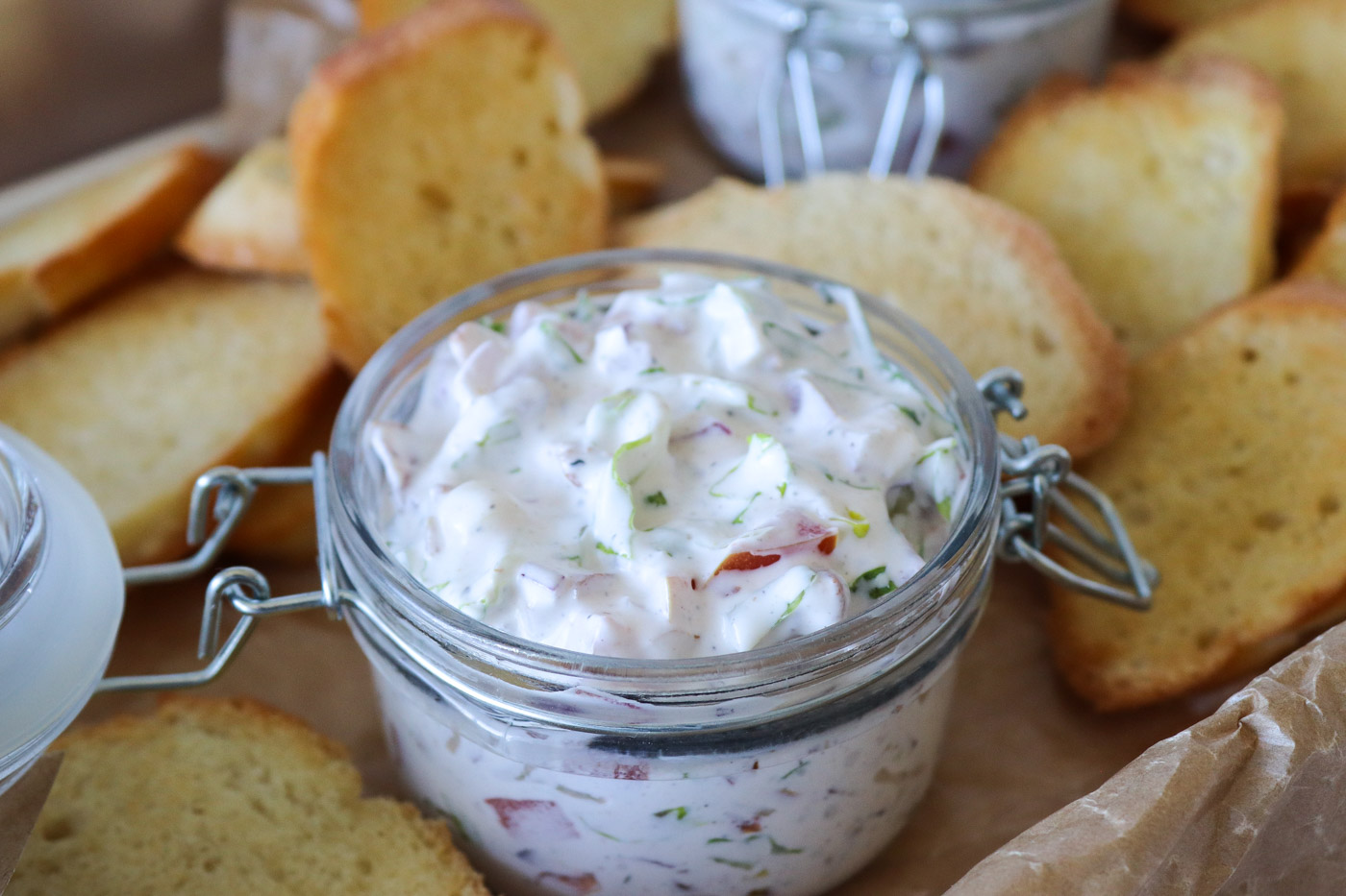 BLT dip smager himmelsk! Det er en dip, som virkelig kan glæde alle der elsker bacon! Det er den perfekt dip til bordet, når gæsterne kommer eller en lækker dip til bordet ude på terassen, når varmen udenfor skal nydes. Jeg bruger sprøde smørbagte brød til at dyppe i, men grøntsagsstænger eller brødstænger ville også være gode til. Dippen er også lækker i en sandwich med extra salat!