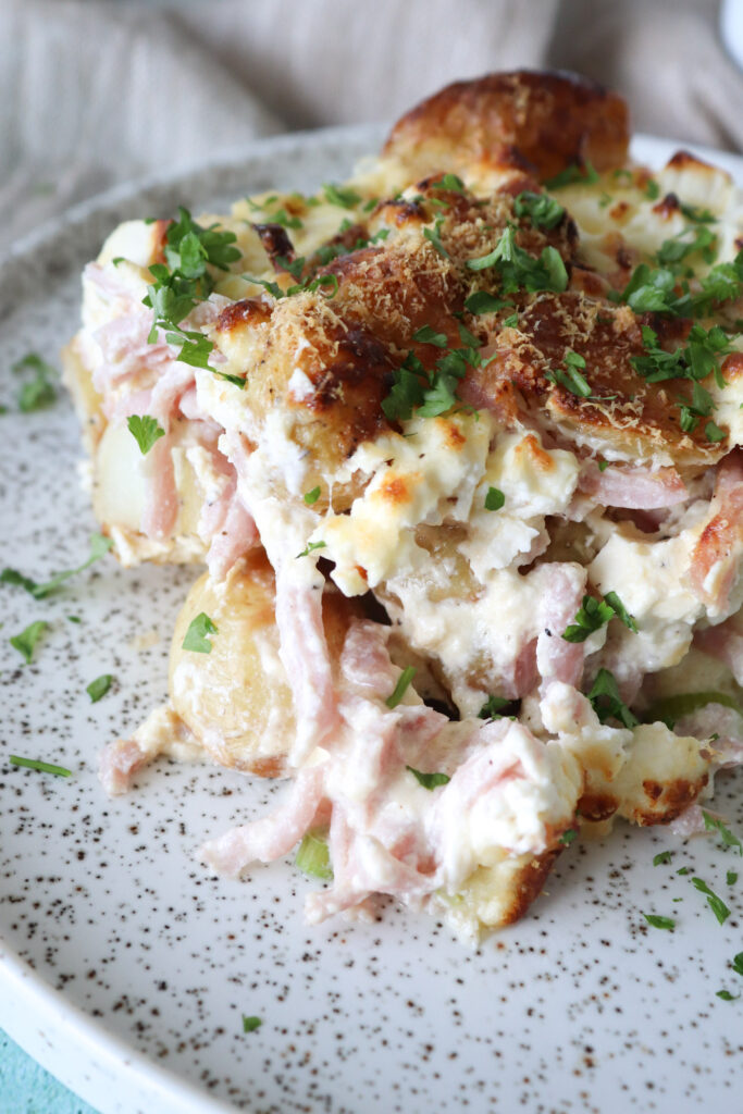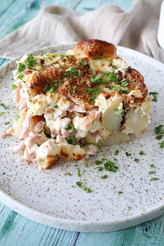 Fantastisk lækkert kartoffelfad, som hele familien vil elske! Det er lavet med ovnbagte kartofler for at give retten en endnu bedre smag. Jeg har blandt andet skinke, feta og flødeost i min, som gør retten så lækker og cremet.