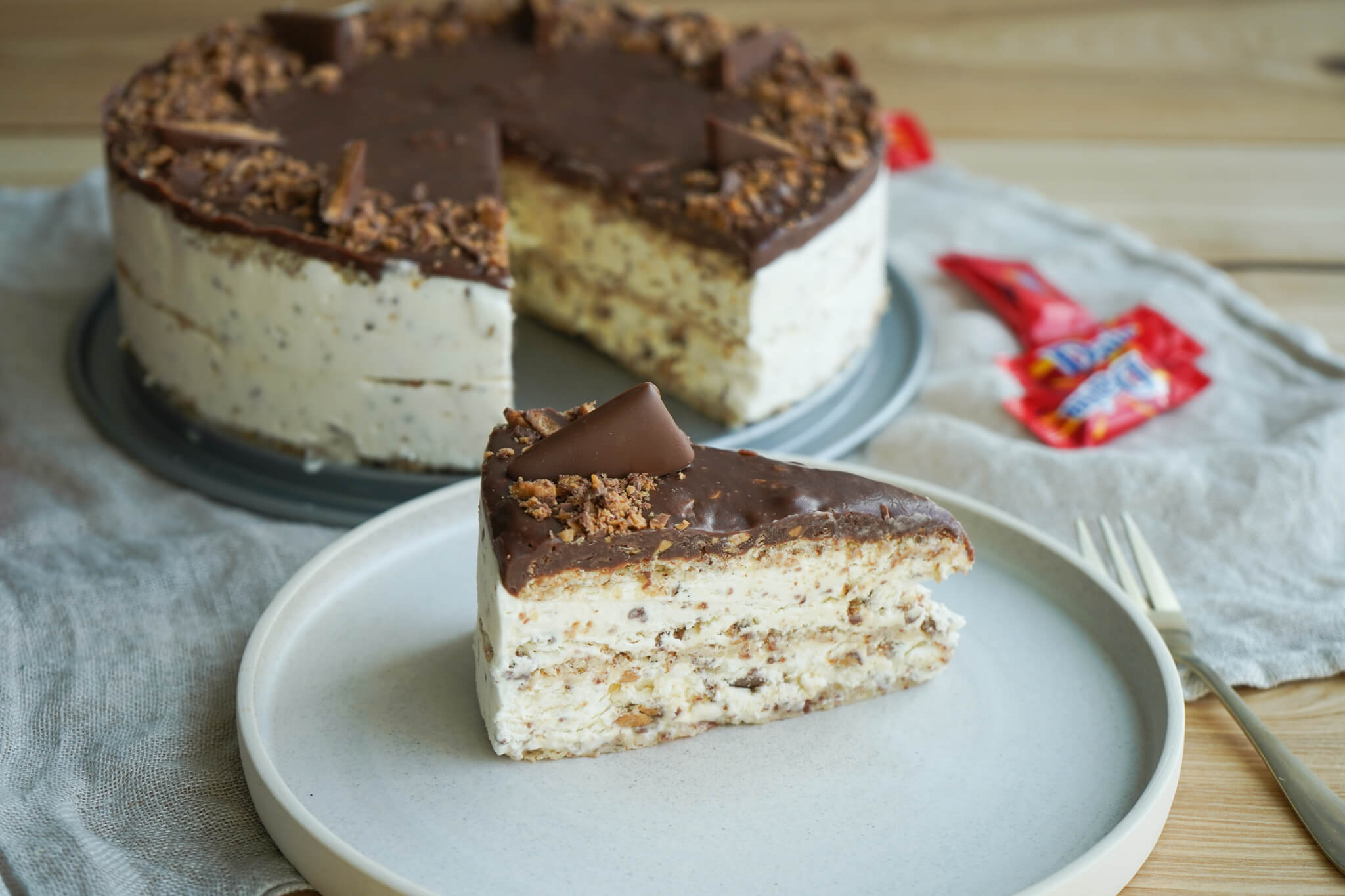 - Vend 50 g hakket daim i og fordel mikset på toppen af islagkagen.