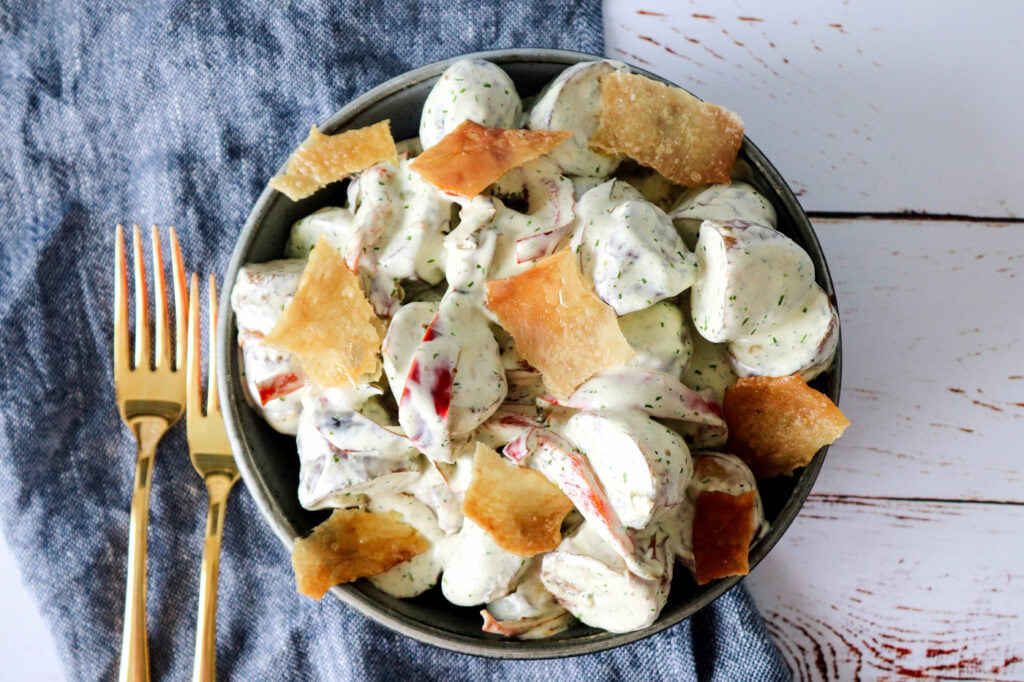Onsdag – En lækker kartoffelsalat med bagt peberfrugt, skøn purløgsdressing og sprødt kyllingskind går man aldrig galt i byen med! Perfekt tilbehørt til sommerbordet evt. til frikadeller, pølser, kylling eller en bøf.