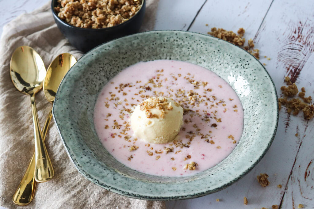 Fredag – Det er jo fredag! Så aftenens menu står på jordbærkoldskål med vaniljeis og ristede havregryn. Hold nu op… det er bare guf! Sommeren er her, så lad os nyde masser af fantastisk koldskål! 🙂