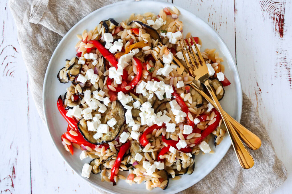 Mandag – Lad os starte denne uge ud med en vildt skøn pastasalat! Denne er med bagt aubergine og peberfrugt, tomatsalat og feta. Den smager fantastisk! Server den evt med brød til og en god bøf eller kylling.