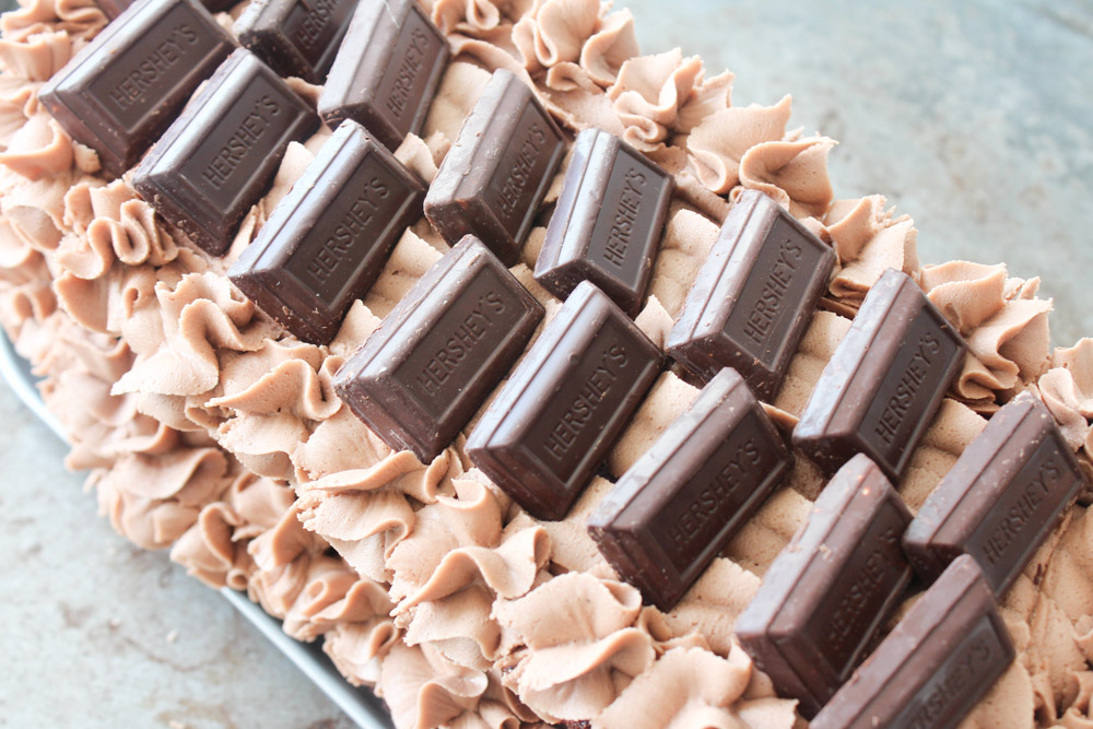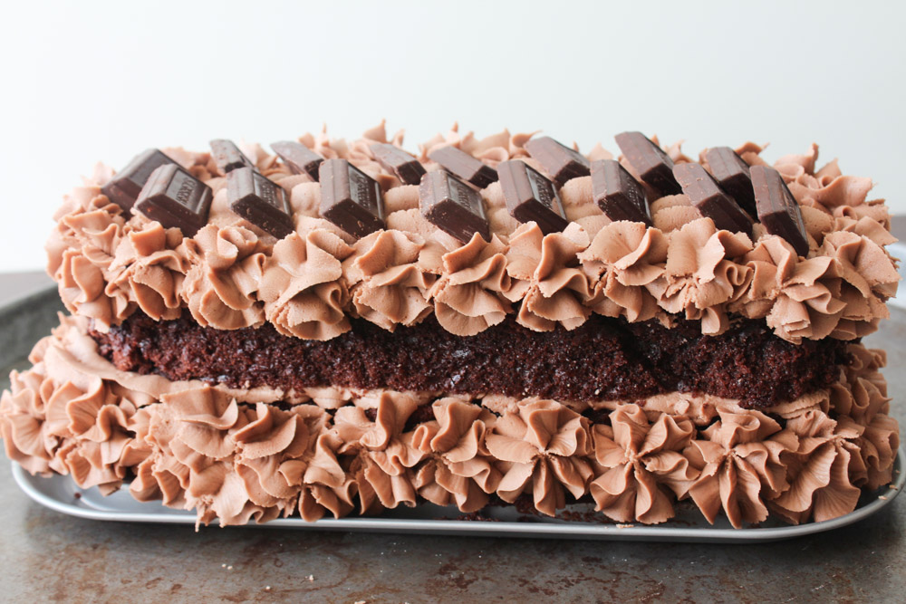 Der er ret meget smørcreme, så det er ikke sikkert at du kommer til at bruge det hele. Kom halvdelen i en sprøjtepose med en tip yderst og kom noget på den nederste halvdel af kagen og kom den anden halvdel af kagen ovenpå. Pynt så toppen af kagen og evt ydresiden af kagen, som du ønsker. Jeg tilføjede også lidt mørk chokolade på toppen. Stil kagen i køleskabet indtil den skal serveres. Kagen kan også sagtens fryses med smørcremen på.