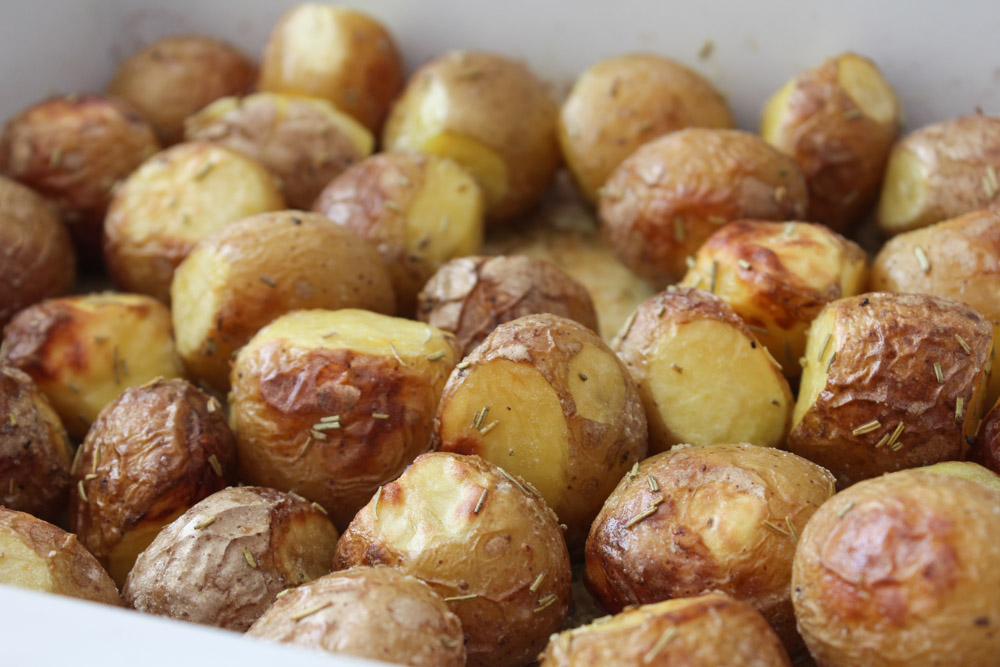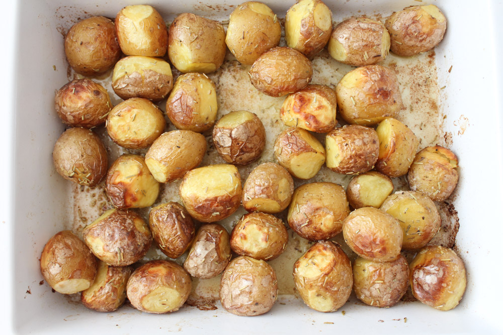 Kom kartoflerne i et fad og hæld lidt olie ud over. Drys så salt og rosmarin over dem. Bland det lidt og sæt dem så i ovnen i cirka 30 minutter, tag dem ud og kom lidt smør på dem og stil dem så i ovnen igen til de er færdige (cirka 5 minutter).
