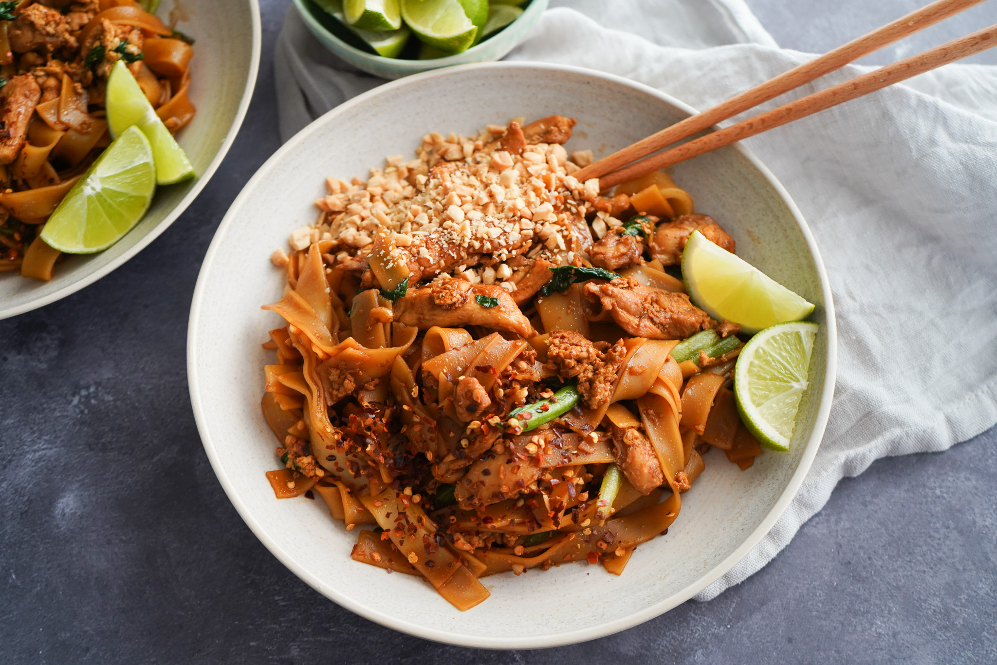 Pad see ew en thailandsk nudelret med kylling og æg. Retten er færdig på 20 minutter og den smager fantastisk. Toppet med peanuts, chili og serveret med lime.
