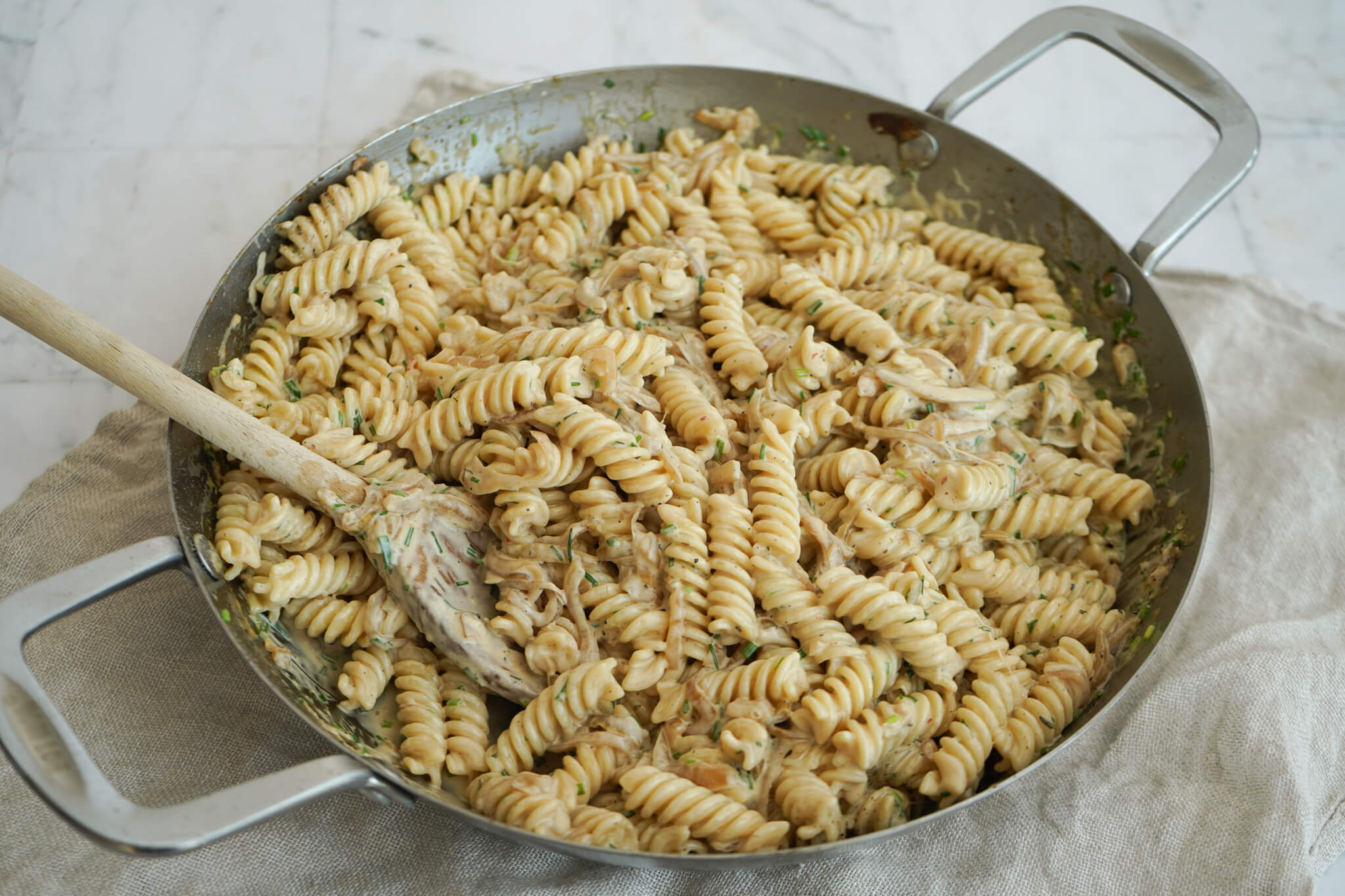 Pastaretter er altid bedst serveret med det samme, fordi pastaen suger saucen til sig. Men med det sagt kan den fint nydes dagen efter eller holde sig 2-3 dage i køleskabet i lufttæt beholder. Jeg anbefaler at lune pastaretten i f.eks. mikroovnen eller skal den piftes op – så kom den i et fad og riv lidt god ost over og lun den i ovnen.