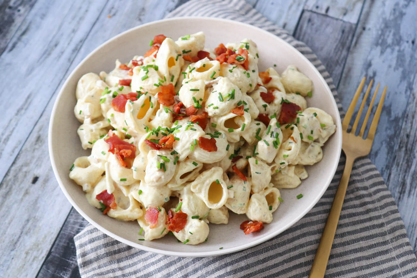 Jeg serverede med lidt ekstra stegt bacon og purløg på toppen for at pynte pastasalaten, men det er helt valgfrit.