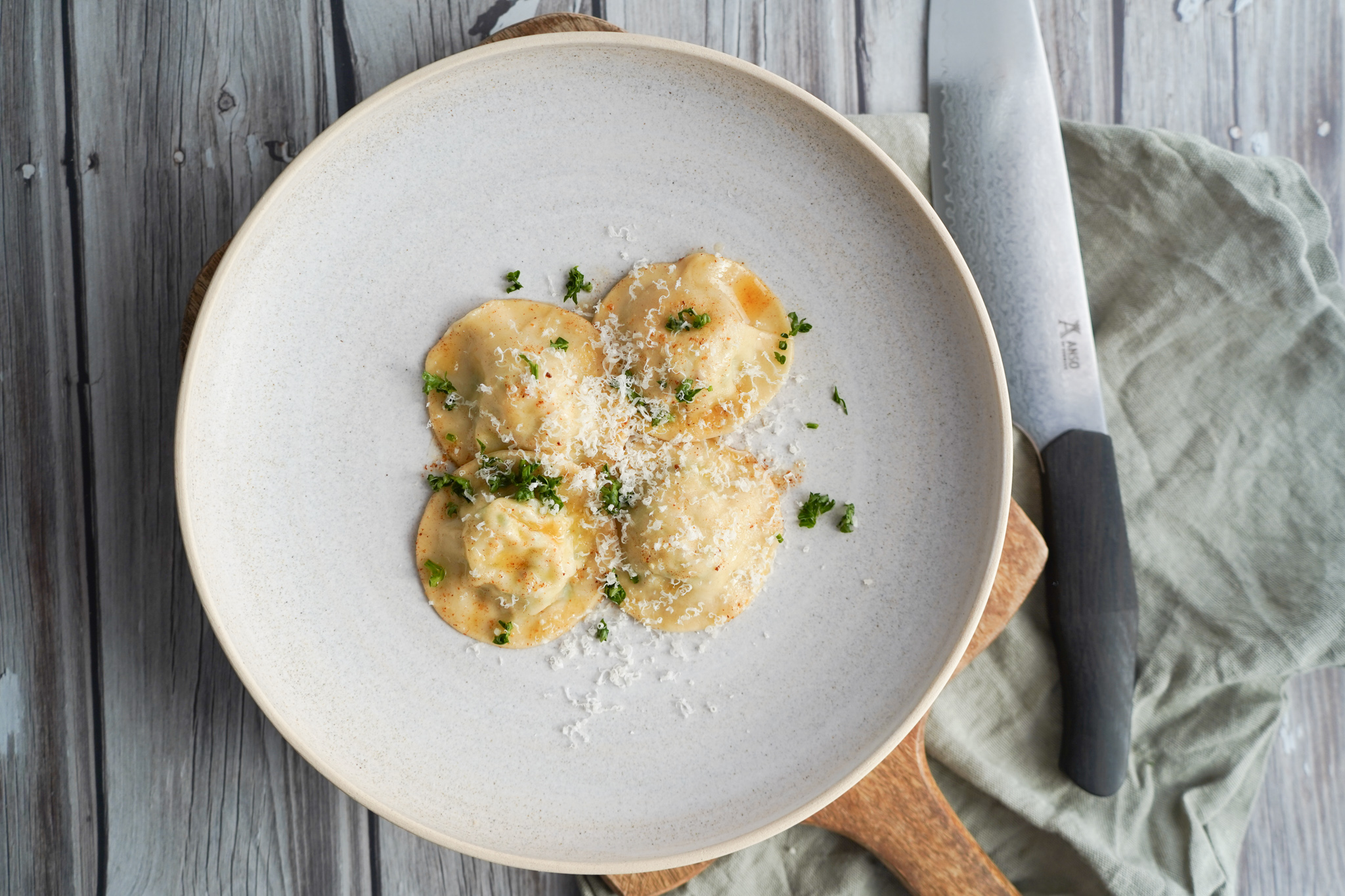 - Vend de færdige raviolier i det brunet smør og herefter er de klar til servering – gerne med lidt frisk hakket persille og revet parmesan.