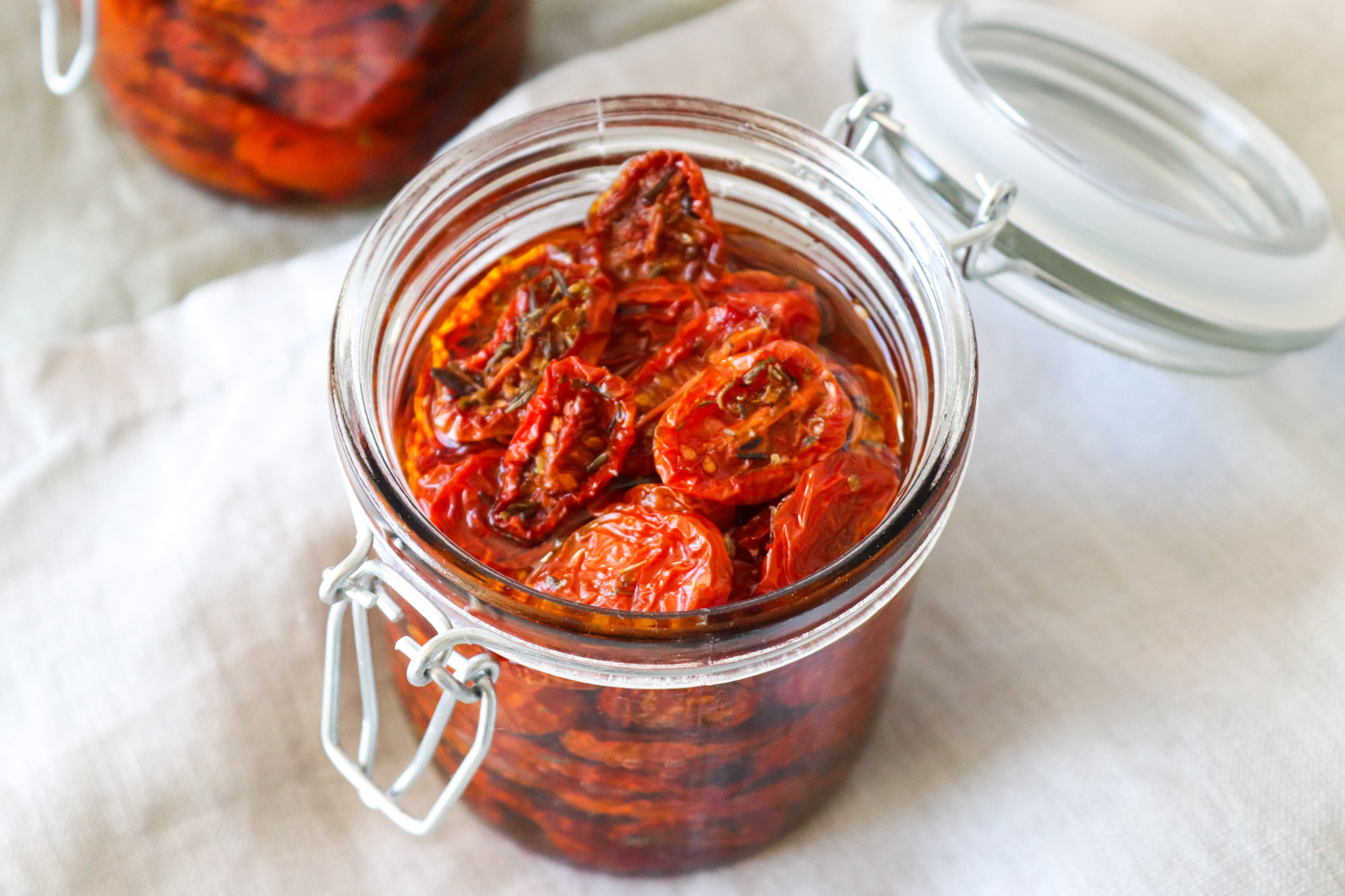 Du kan godt lade være med at dække tomaterne med olie, men det vil formindske holdbarheden og jeg synes at olien gør dem ekstra lækre, fordi olien får smag af tomaterne med tiden og så er lidt af olie sammen med tomaterne lækre rørt med lidt pasta eller til kartofler – Du kan blot huske at drysse lidt ekstra salt på pastaen eller kartoflerne for at fremhæve tomatsmagen.
