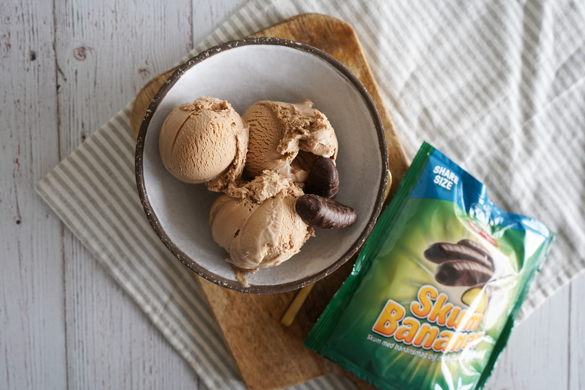 Skumbananis er en lækker hjemmelavet is med smag af chokoladeovertrukket skumbananer.