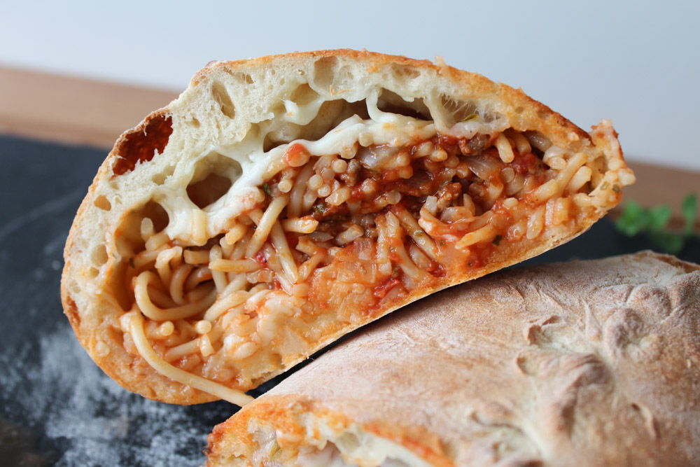 Jeg lavede en stor portion spaghetti bolognese igår. Da vi skal have det igen i aften ville jeg pifte det lidt op. Det blev fyldet i nogle calzones, og de blev bare så lækre! Dejen er sprød og fyldt med luftbobler og spaghetti bolognesen inden i med ost – så godt!