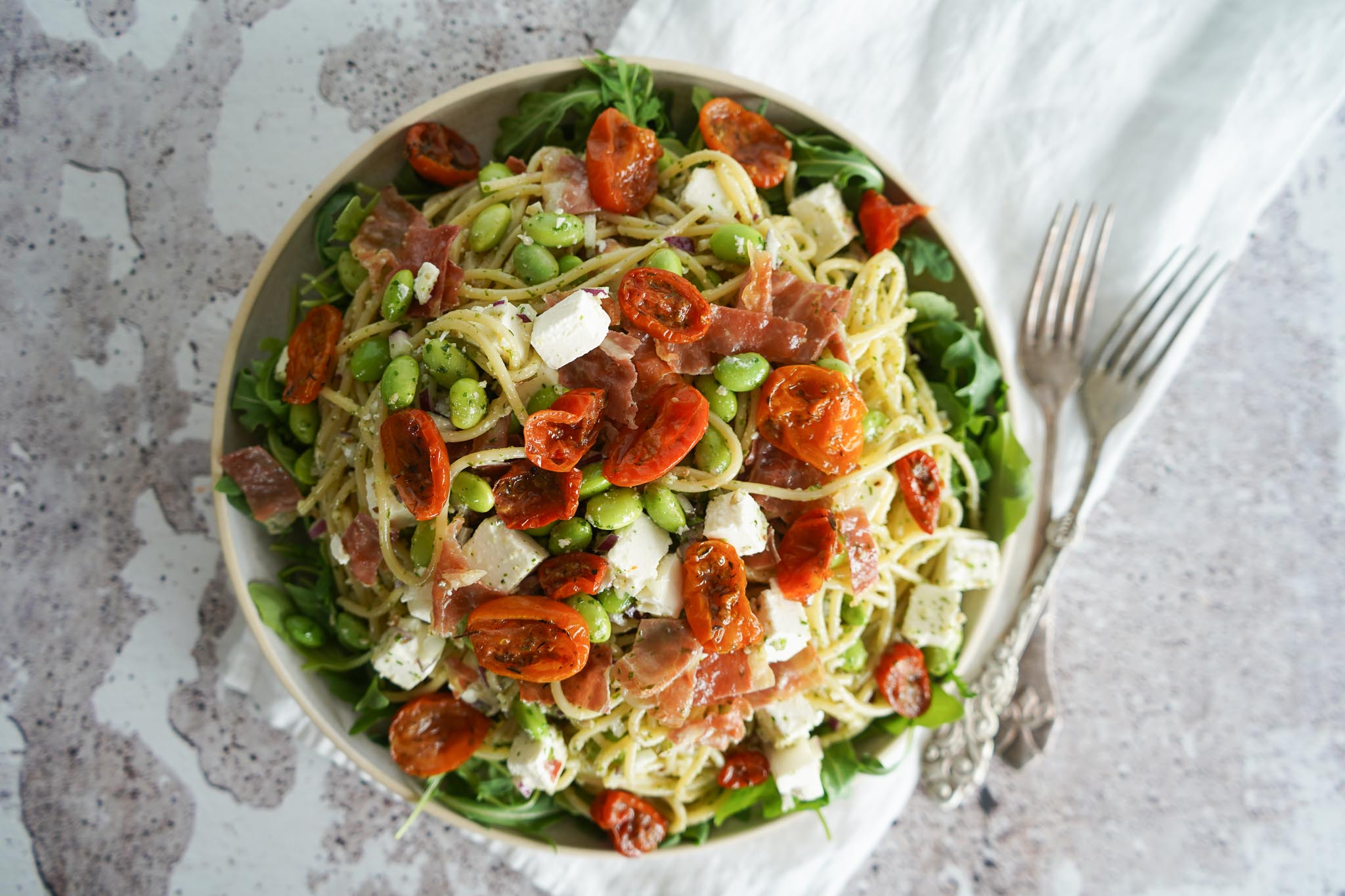 Spaghettisalat med pesto, feta, semitørrede tomater og sprødt parmaskinke smager fantastisk. Den kan nydes som tilbehør eller som måltid med lækkert brød til.