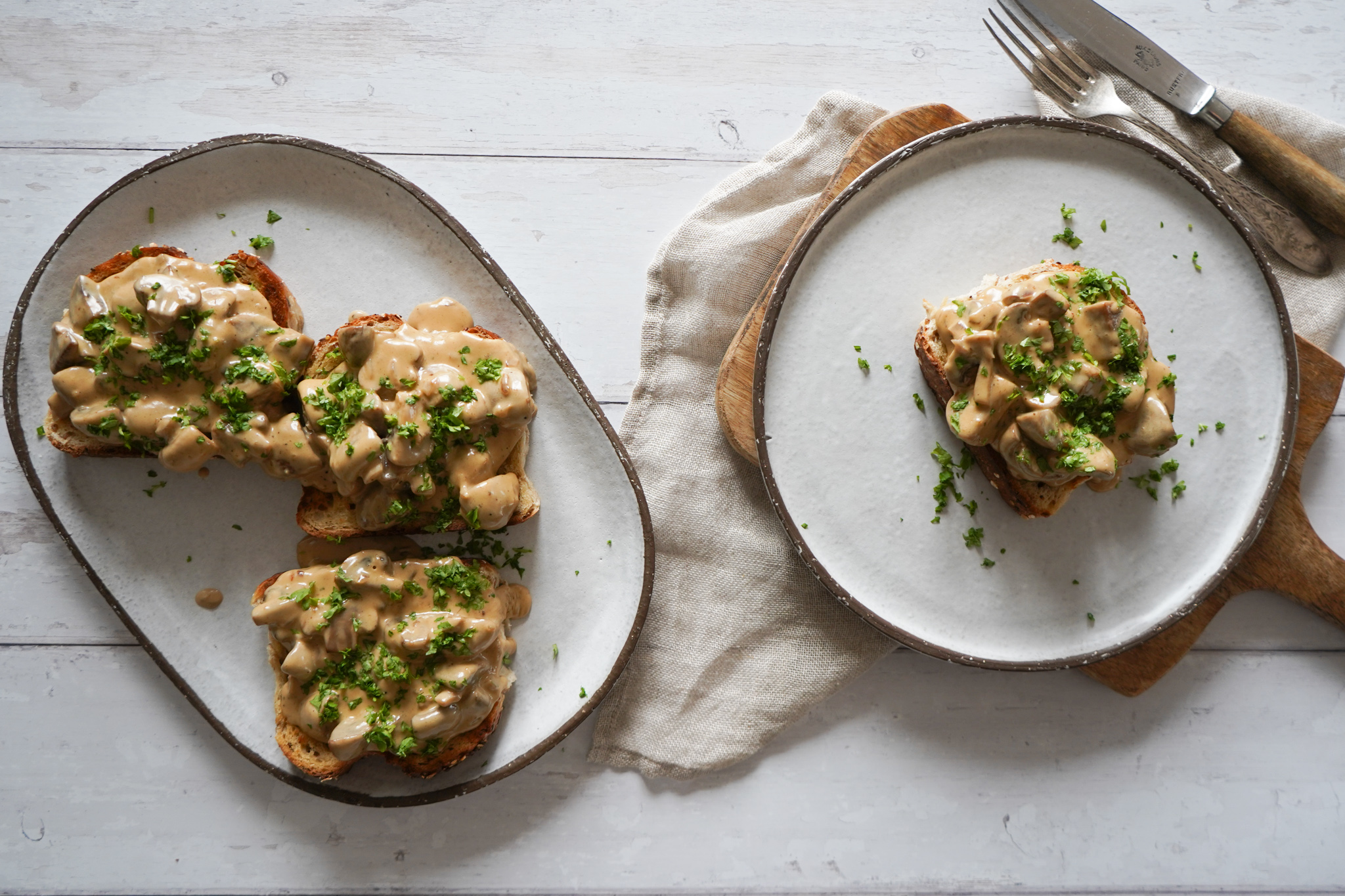 Svampe a la creme smager himmelsk. Svampesauce serveret på smørriset brød er den perfekte forret til gæsterne.