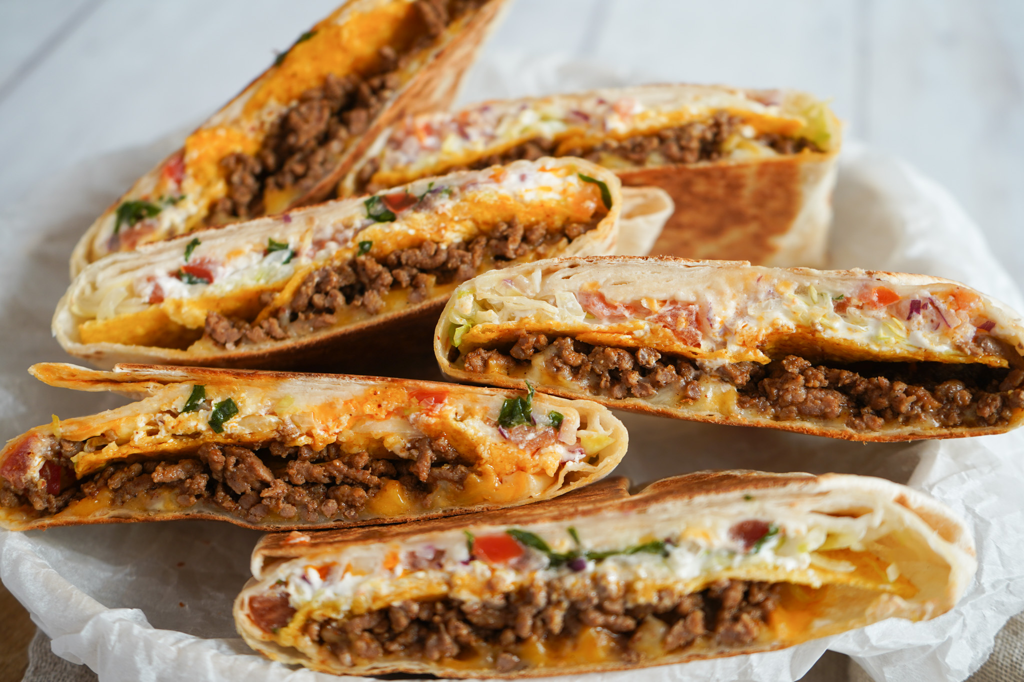 Taco crunch wrap med tacokrydret oksekød, ost, salat, hjemmelavet salsa og sprøde chips. Nemt og mega lækkert.