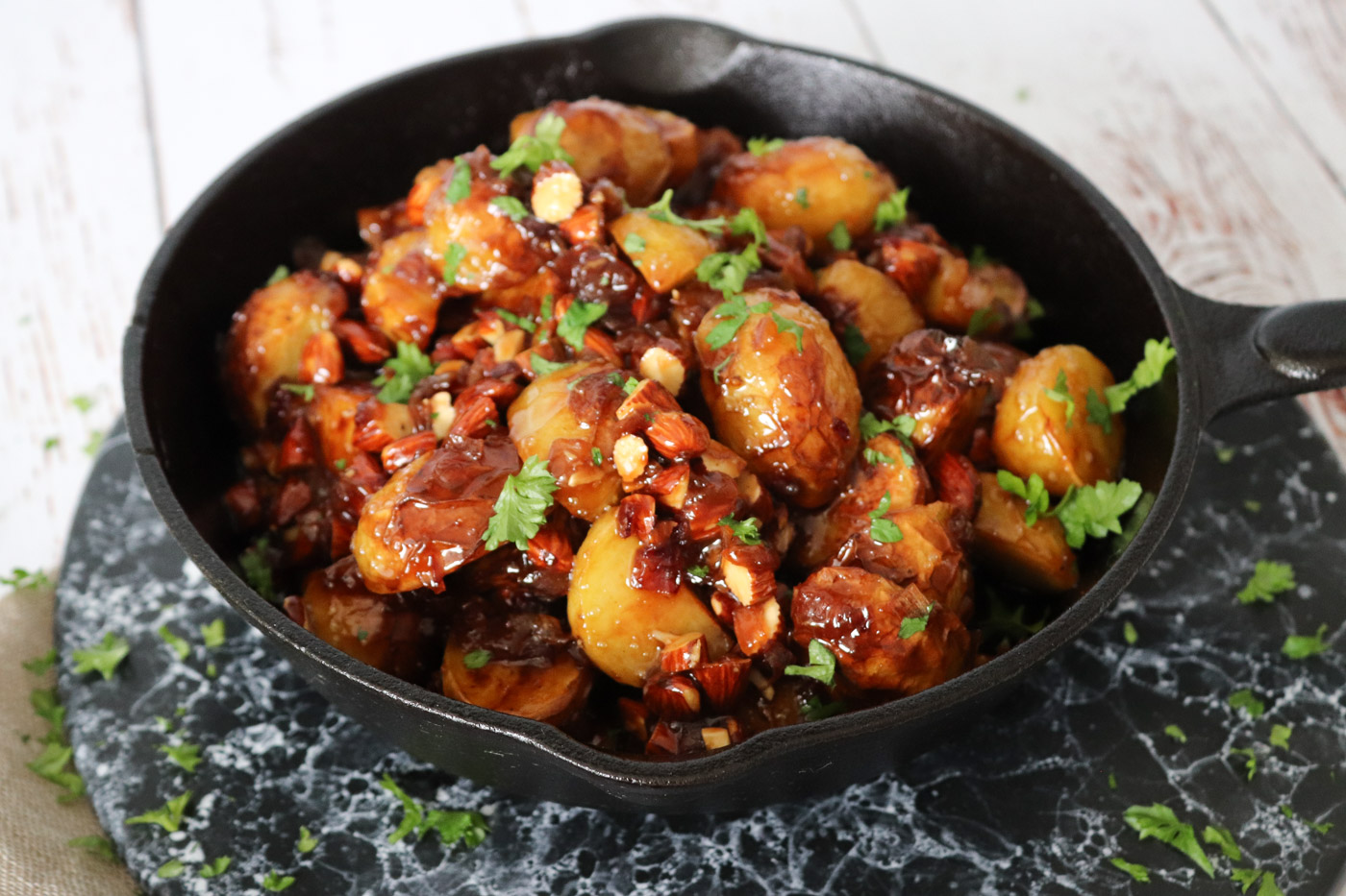 Karameliseret Ovnbagte Kartofler Med Mandler Og Rødløg