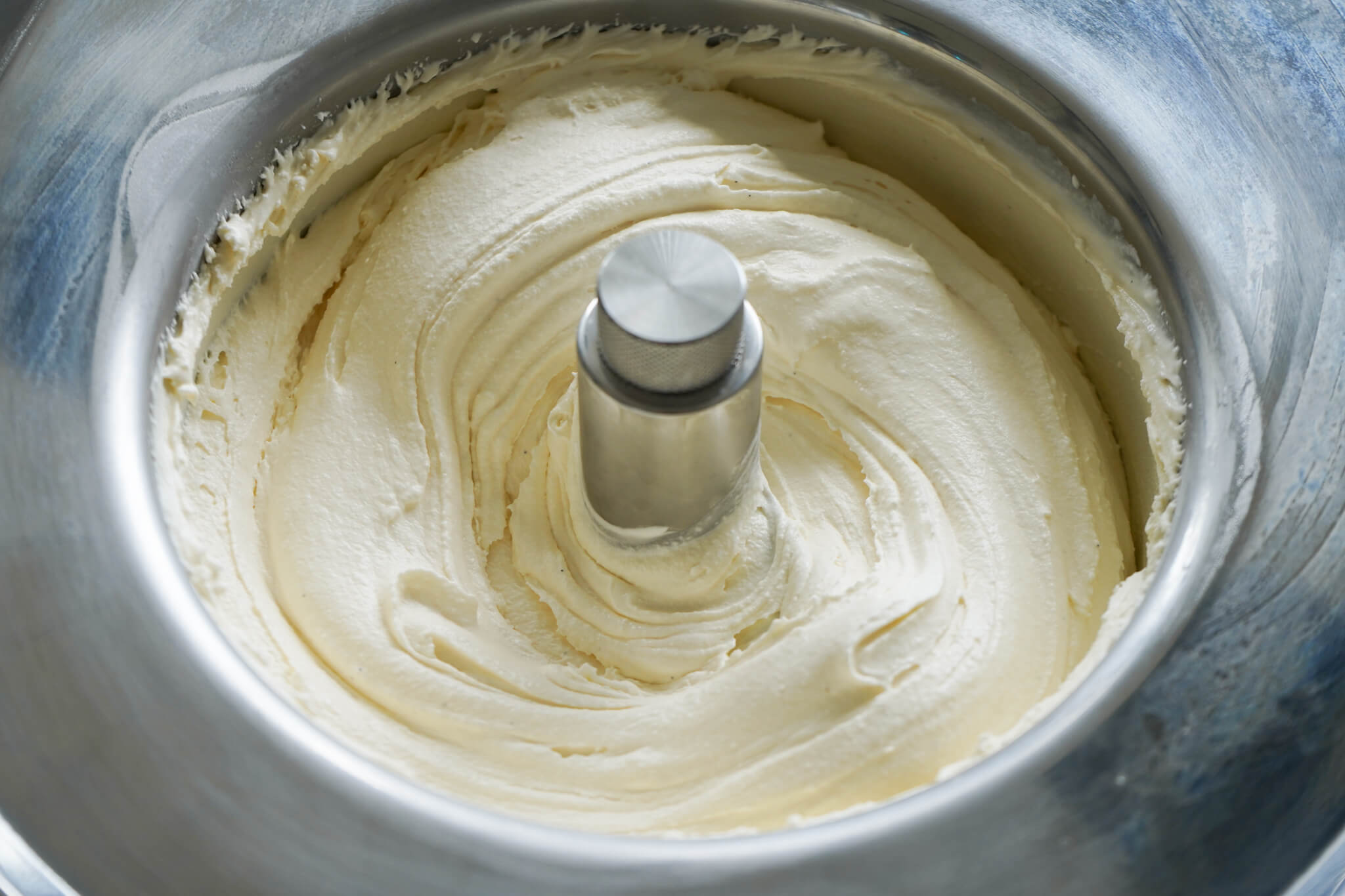 Lige med flødeis, som er så tung på fløden som denne, er det vigtigt, at der kun bruges et almindeligt piskeris, når mælk og fløde kommer i. Jo mere fløde piskes, desto større chance er der for at den tykner eller ligefrem skiller og det ønskes der ikke for denne is + den skal på ismaskine senere. Men så længe der bruges almindeligt piskeris er der ingen fare på færd.